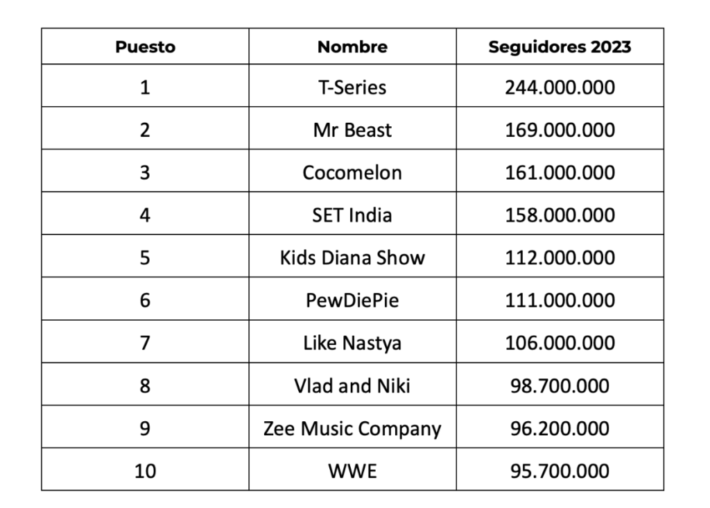 10 canales con más seguidores a nivel mundial